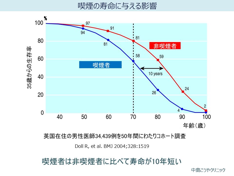アンチエイジングために禁煙は必須条件です。喫煙による死亡リスクを検討したコホート研究によると、35歳以降も喫煙を続けている人は、非喫煙者に比べて寿命が約10年短いと報告されています。しかし、喫煙者でも35~44歳までに禁煙すると、非喫煙者の寿命に追いつけることが明らかになりました。